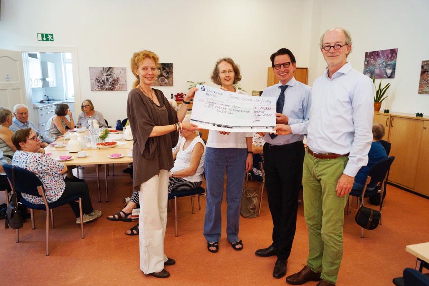 Über eine großzügige Spende der Krefelder Stiftung „sene cura" in Höhe von 15.000 Euro kann sich der Linner Seniorenclub „Em Cavenn" freuen. Klaus Christian Knuffmann, Christiane ThoPesch und Georg Lehmann von der „sene-cura-Stiftung" überreichten im Juni 2018 die Spende und überzeugten sich vor Ort von der Arbeit des Clubs, der von der evangelischen Gemeinde Uerdingen, der katholischen Pfarre St. Nikolaus, dem Bürgerverein Linn und der Caritas getragen wird.